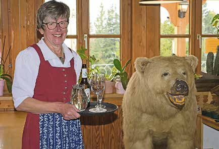 Ein besonderes Wahrzeichen des Hauses ist der ausgestopfte Kodiakbär im Gastraum. Die Geschichte dahinter erzählt Spannbauer mit einem Lächeln: Ihr Mann war Jagdbegleiter, sein Jagdherr hatte sich mehrere Jahre um die Auslandsjagd bemüht, ehe er einen Abschuss in Alaska erhielt. Nach dessen Schlaganfall durfte schließlich ihr Mann den Bären erlegen. „Der Jagdherr hat ihn in Deutschland präparieren lassen und später hat ihn mein Mann geerbt – wie versprochen. Seitdem steht er hier und gehört einfach zu uns.“ Auch kulinarisch bleibt Spannbauer ihren Wurzeln treu. Hirschgulasch steht derzeit auf der Karte, ebenso wie die beliebten Spareribs – ein Rezept, das sie von ihrem Mann übernommen hat und bis heute selbst zubereitet. „Das Rezept kennt keiner außer mir. Es soll im Haus bleiben“, sagt sie. Neben Klassikern wie überbackenem Schweinefilet, Kässpatzen und Kaiserschmarrn gibt es regelmäßig wechselnde Tagesgerichte.