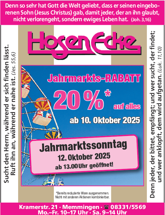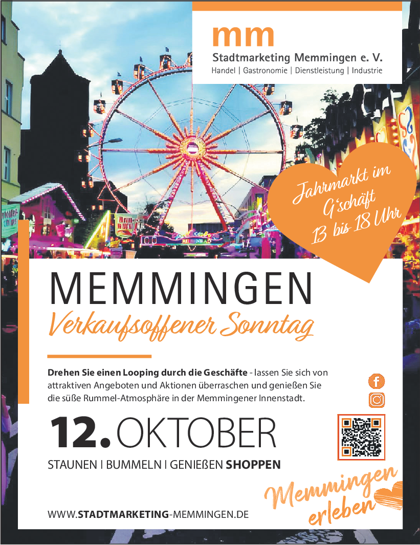 Am Sonntag, dem 12. Oktober, ist verkaufsoffener Sonntag in der Memminger Innenstadt. Die Einzelhandelsgeschäfte können in der Zeit von 13 Uhr bis 18 Uhr ihre Türen öffnen und Ihre Waren anbieten.