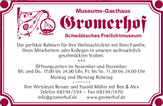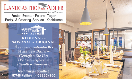 Im Unterallgäu locken die Restaurants mit kreativen Angeboten. Sie kreieren individuelle Weihnachtsmenüs mit Fleisch, vegetarisch oder vegan. Der Gast kann zwischen regionalen, mediterranen oder internationalen Küchen wählen. Wer schon vorab einen Blick in die Speisekarten wirft, findet sowohl echte Klassiker als auch überraschende Variationen.